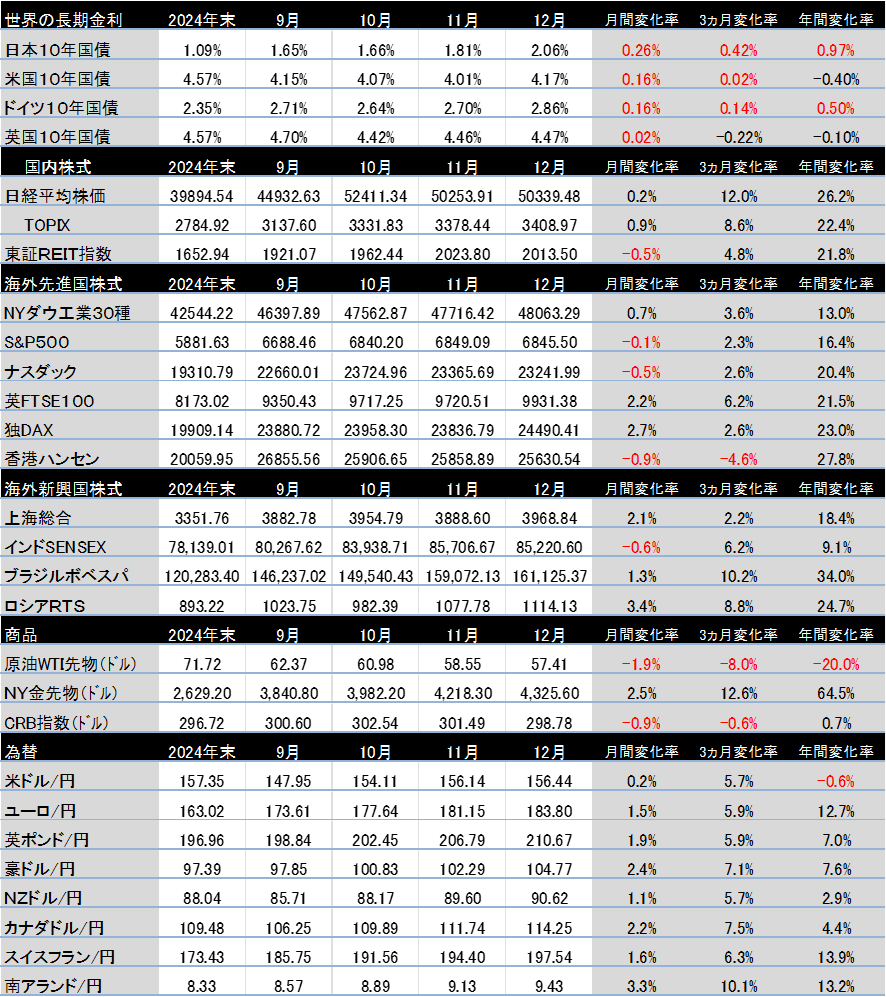 主要中央銀行のスタンスを見ると、先月はFRBが0.25%の利下げ(年3.5%~3.75%)や日銀の0.25%の利上げ(年0.75%)もあり、金利や為替がどのように反応するかも注目点でした(ちなみにECBは現状維持の年2%)。結果、長期債は売られて債券安(利回り上昇)、為替市場では米ドルと円が売られ、ユーロその他通貨が買われる展開となりました。